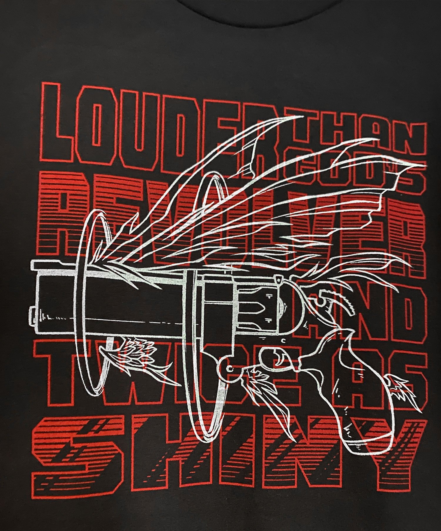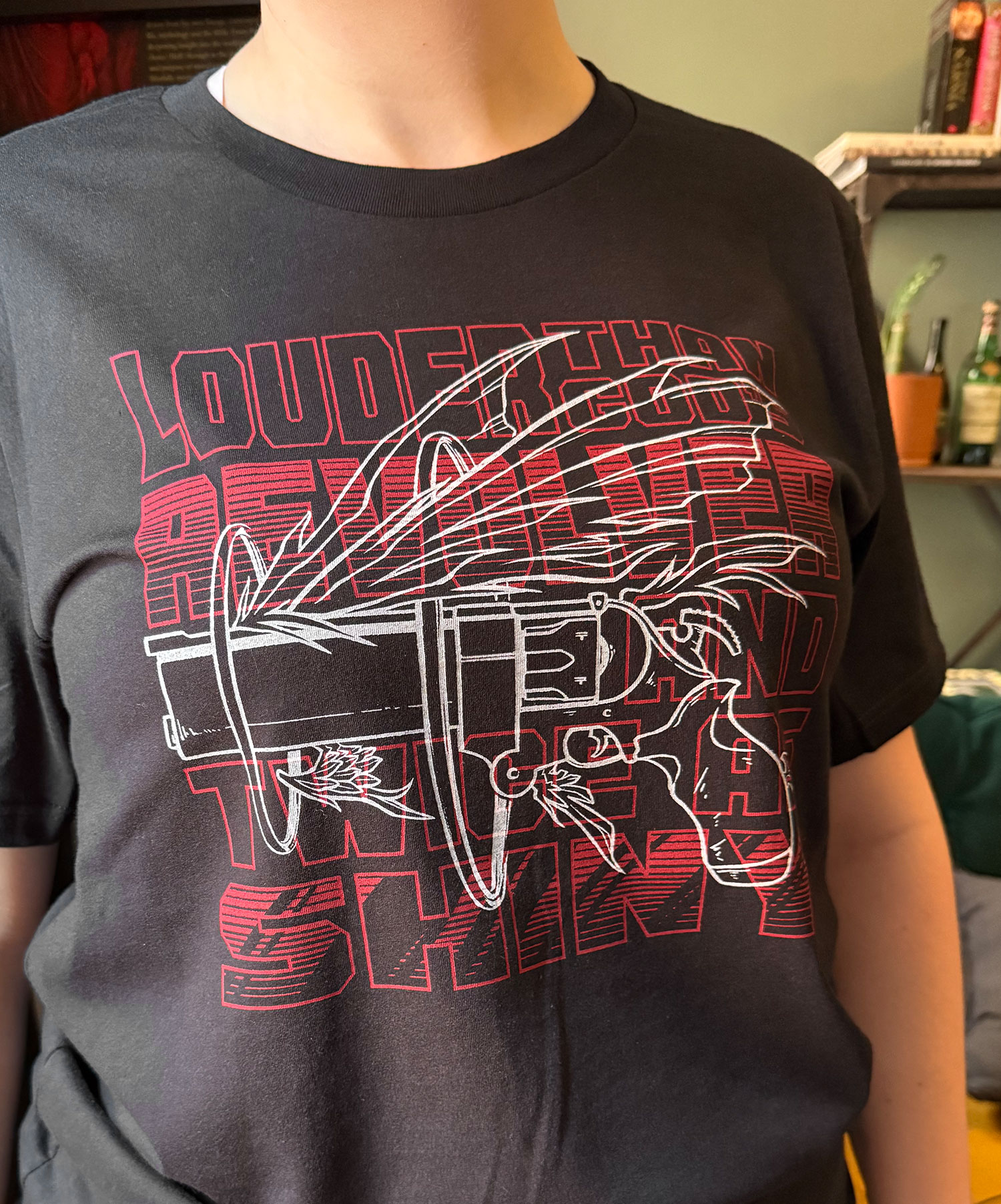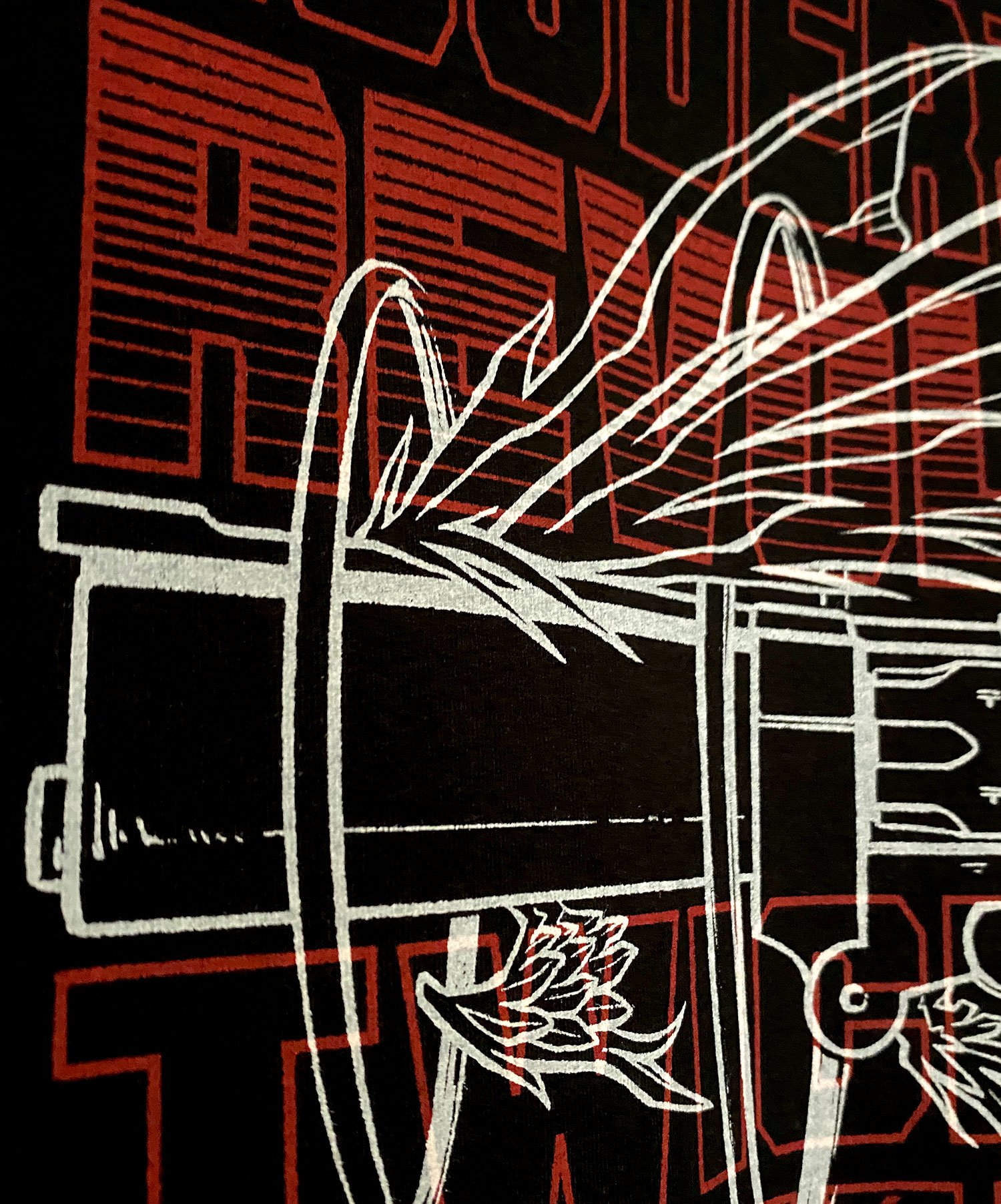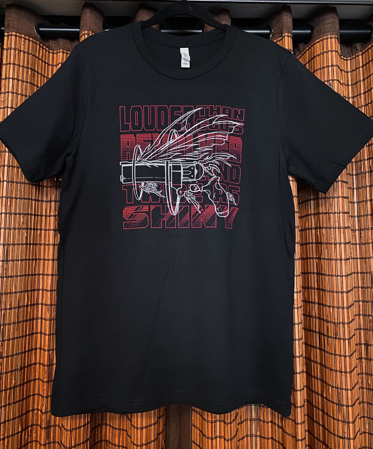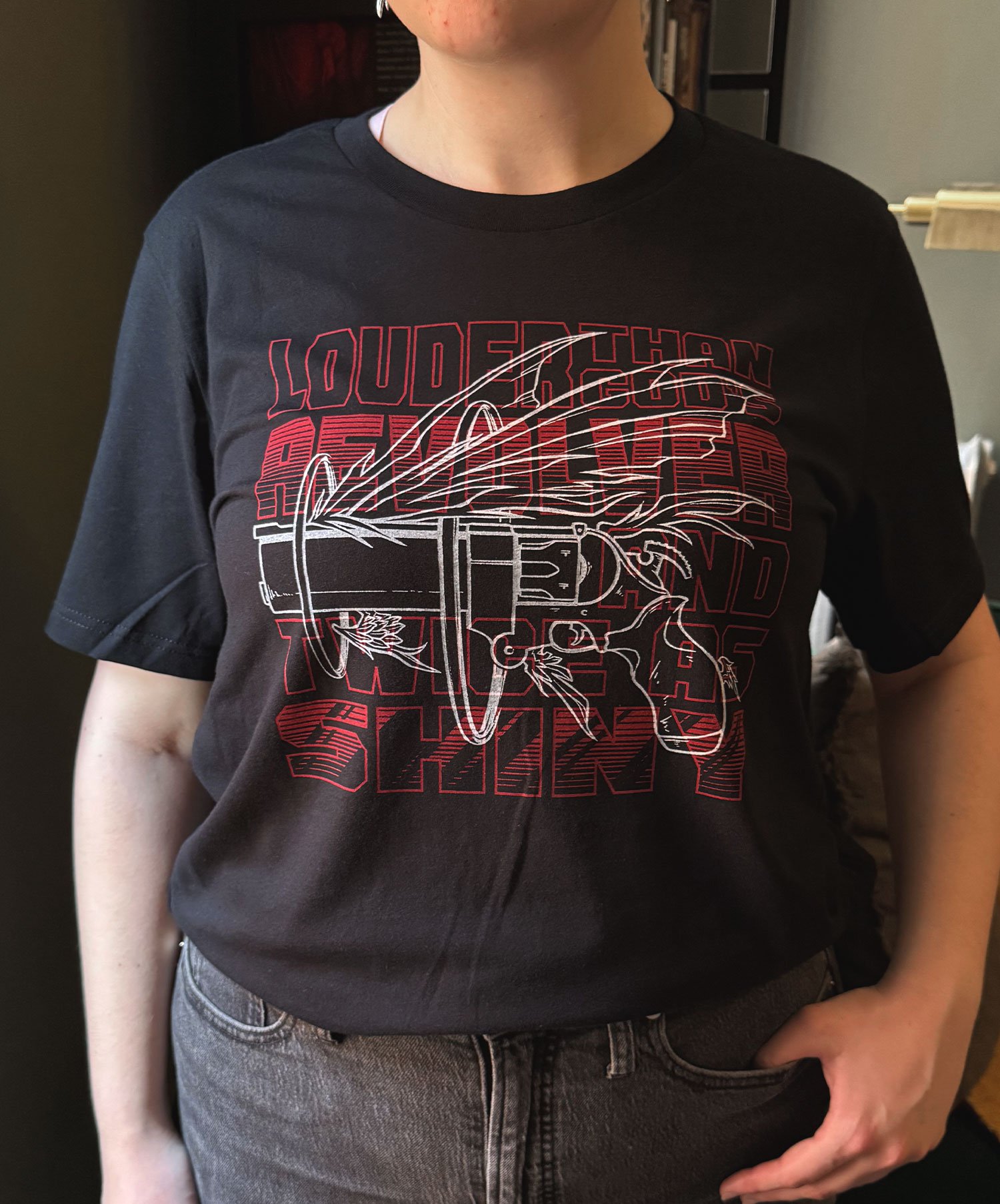 White and red water based ink printed on a black Bella Canvas 100% cotton tee. Sizes XS-4XL available. Model in photos shown wearing a large.