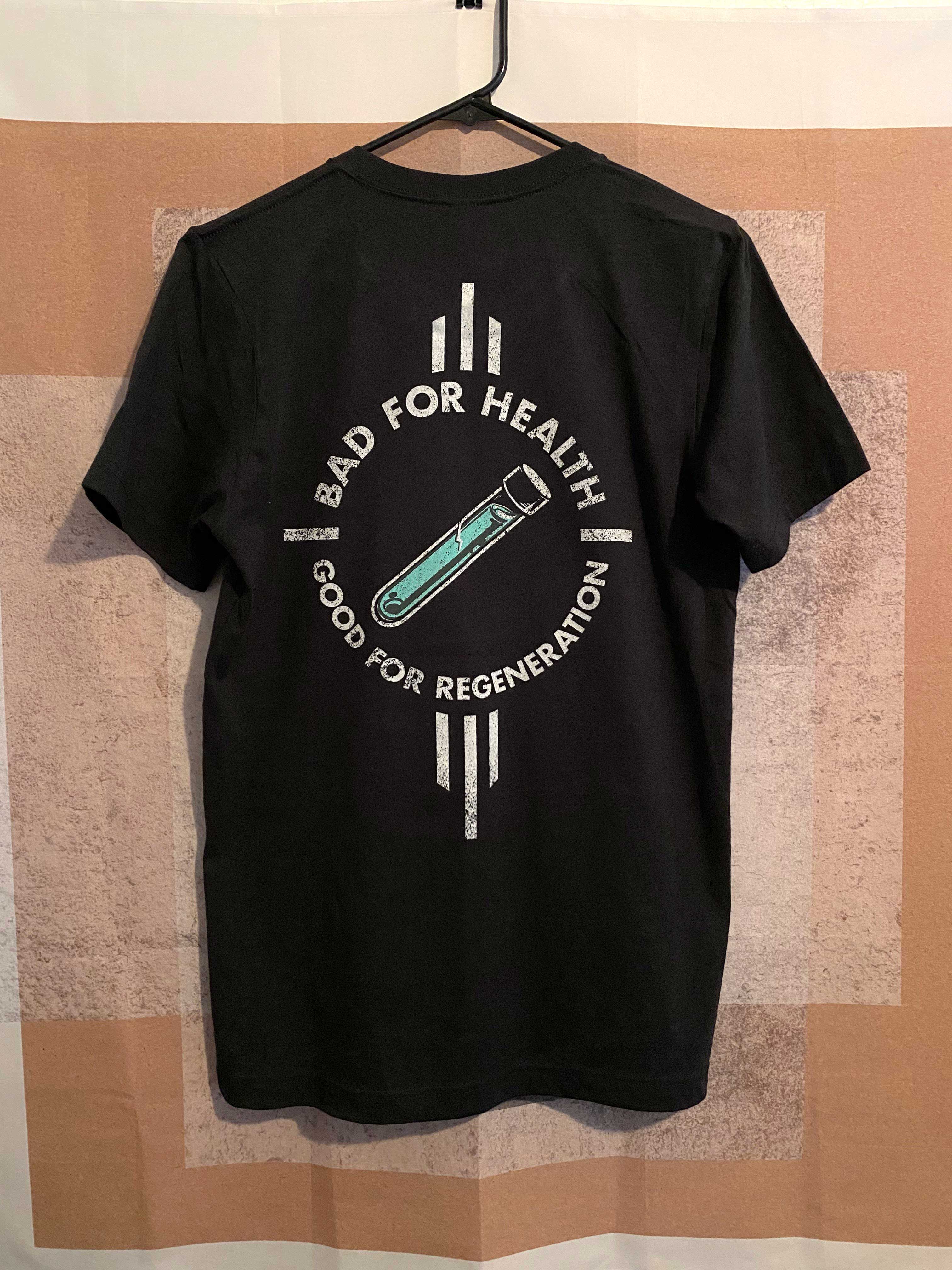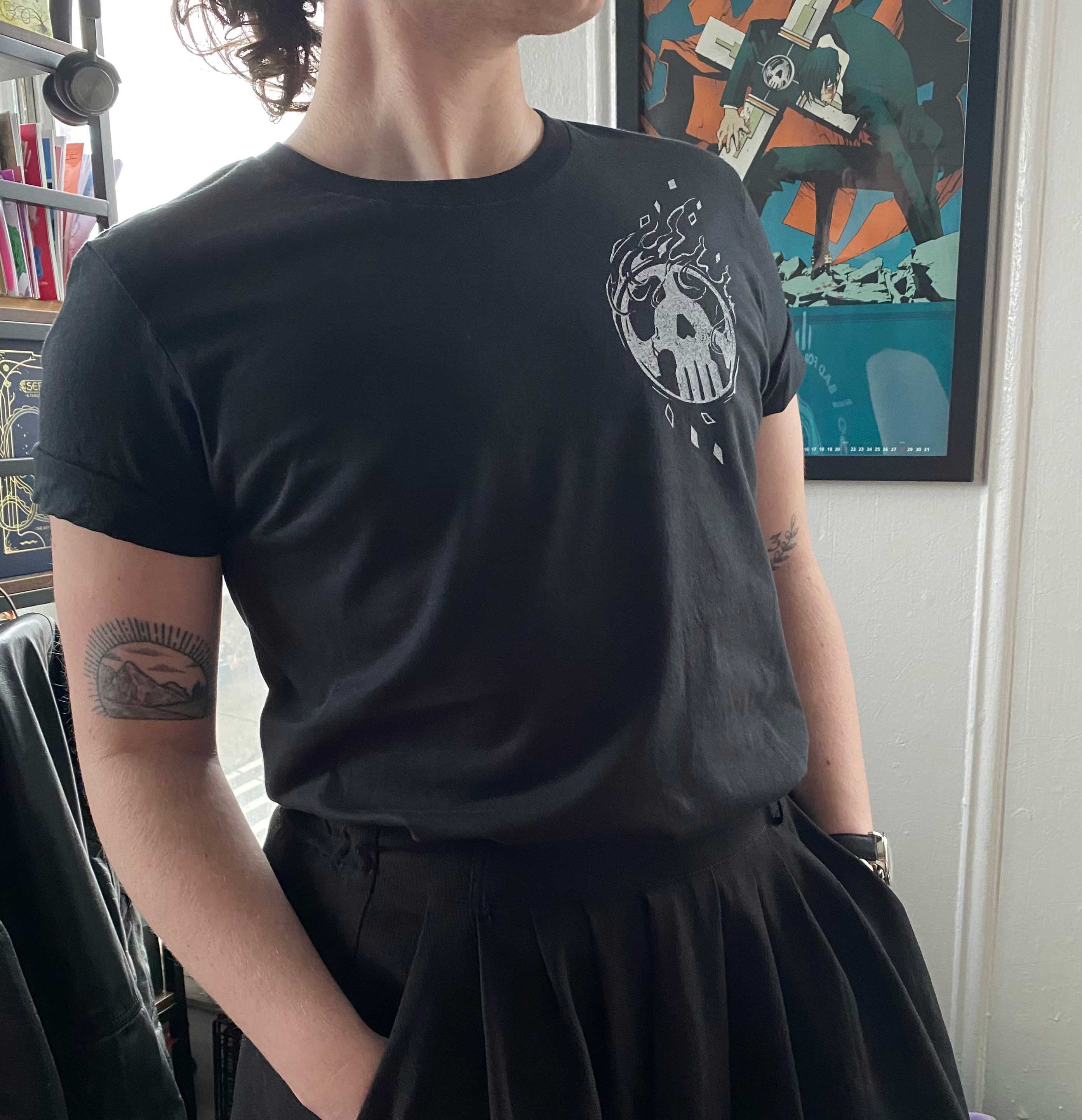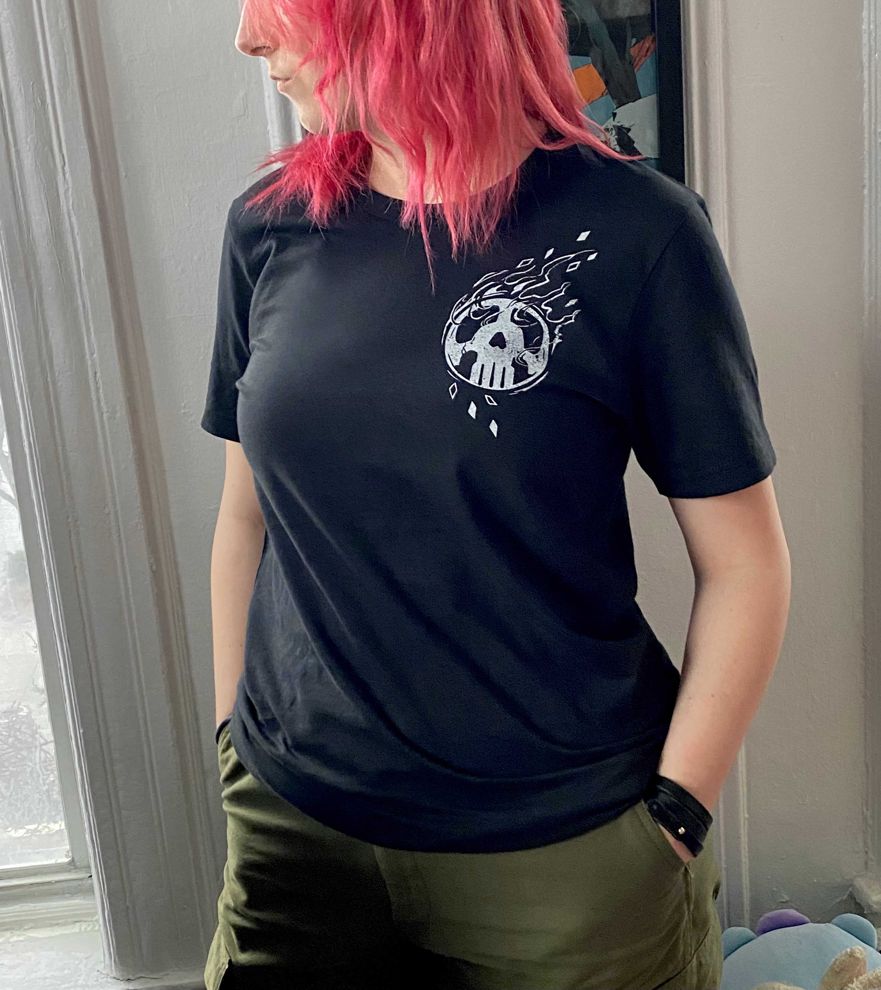 White water based ink with a glow in the dark teal accent printed on a black Bella Canvas 100% cotton tee. Tee features a front pocket design and a full back print. Sizes XS-4XL available. Models in photos shown wearing a medium.