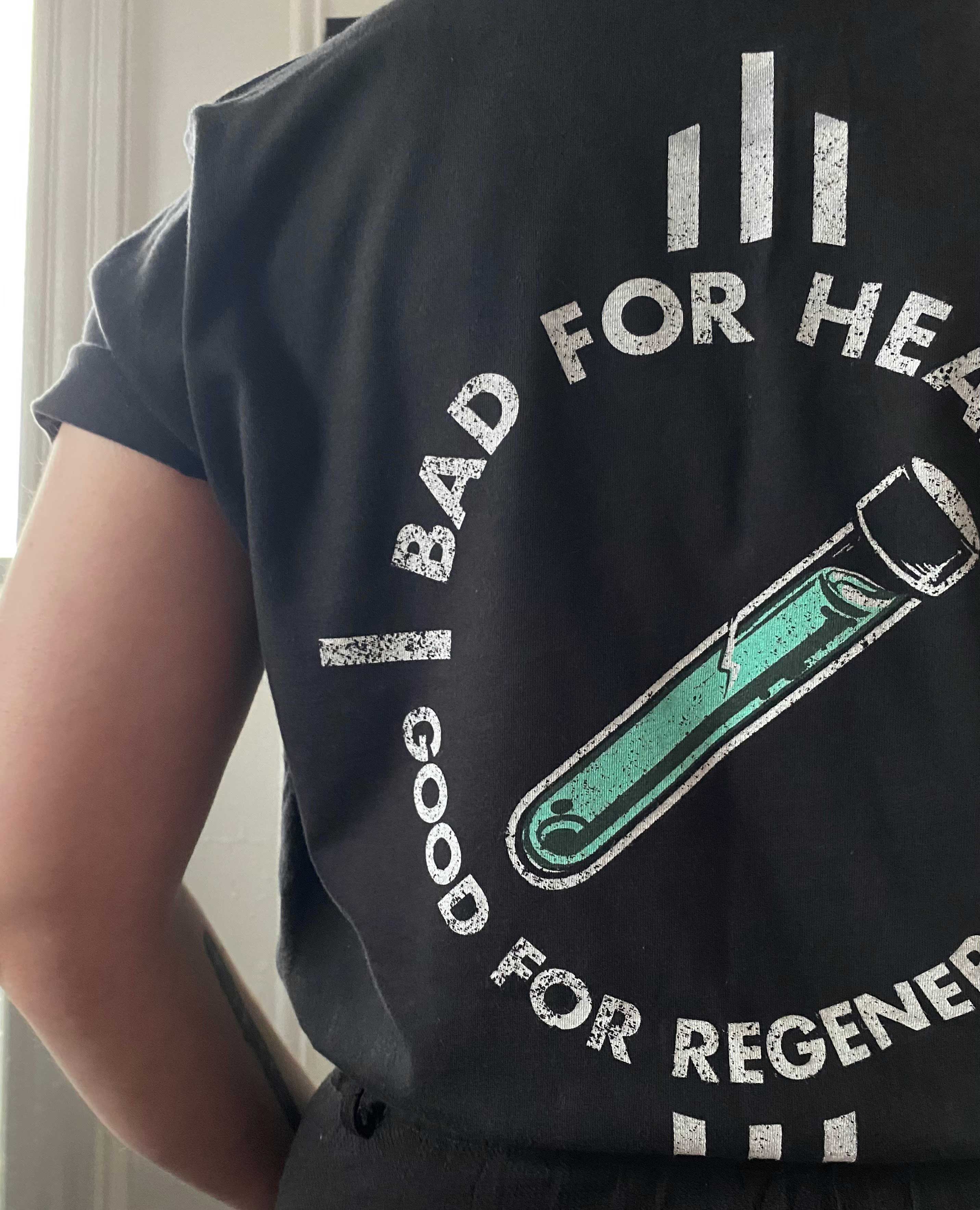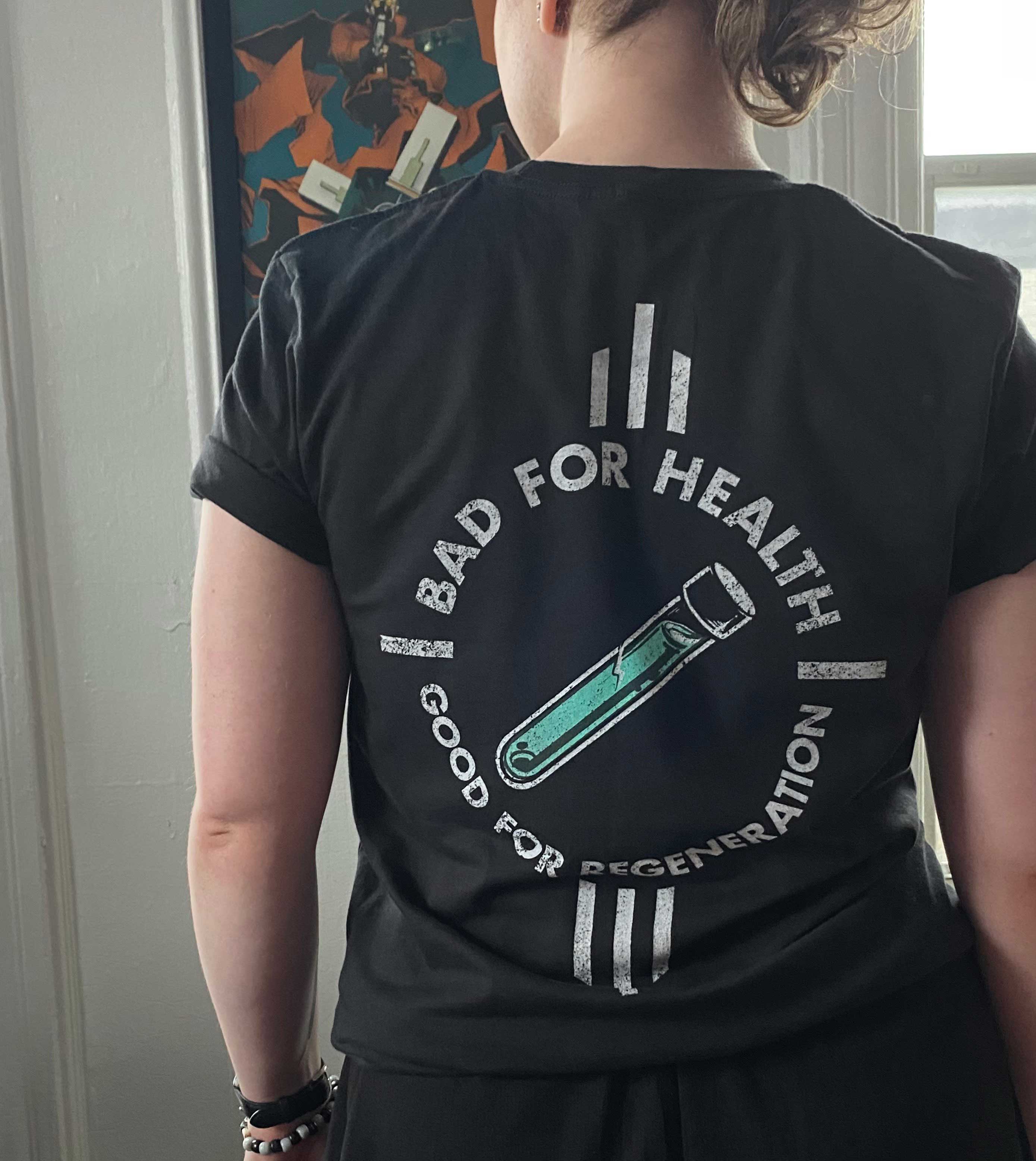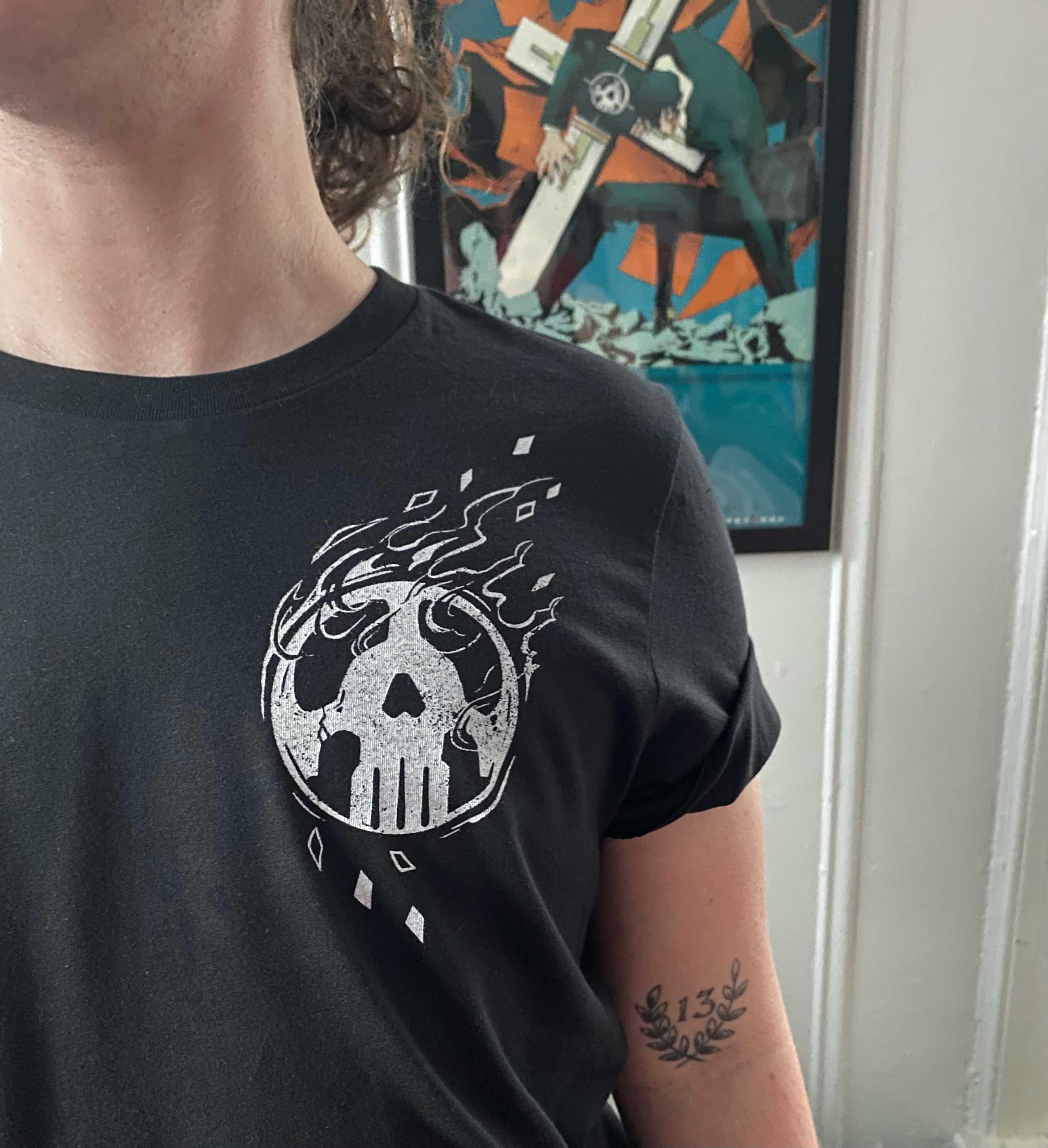 White water based ink with a glow in the dark teal accent printed on a black Bella Canvas 100% cotton tee. Tee features a front pocket design and a full back print. Sizes XS-4XL available. Models in photos shown wearing a medium.