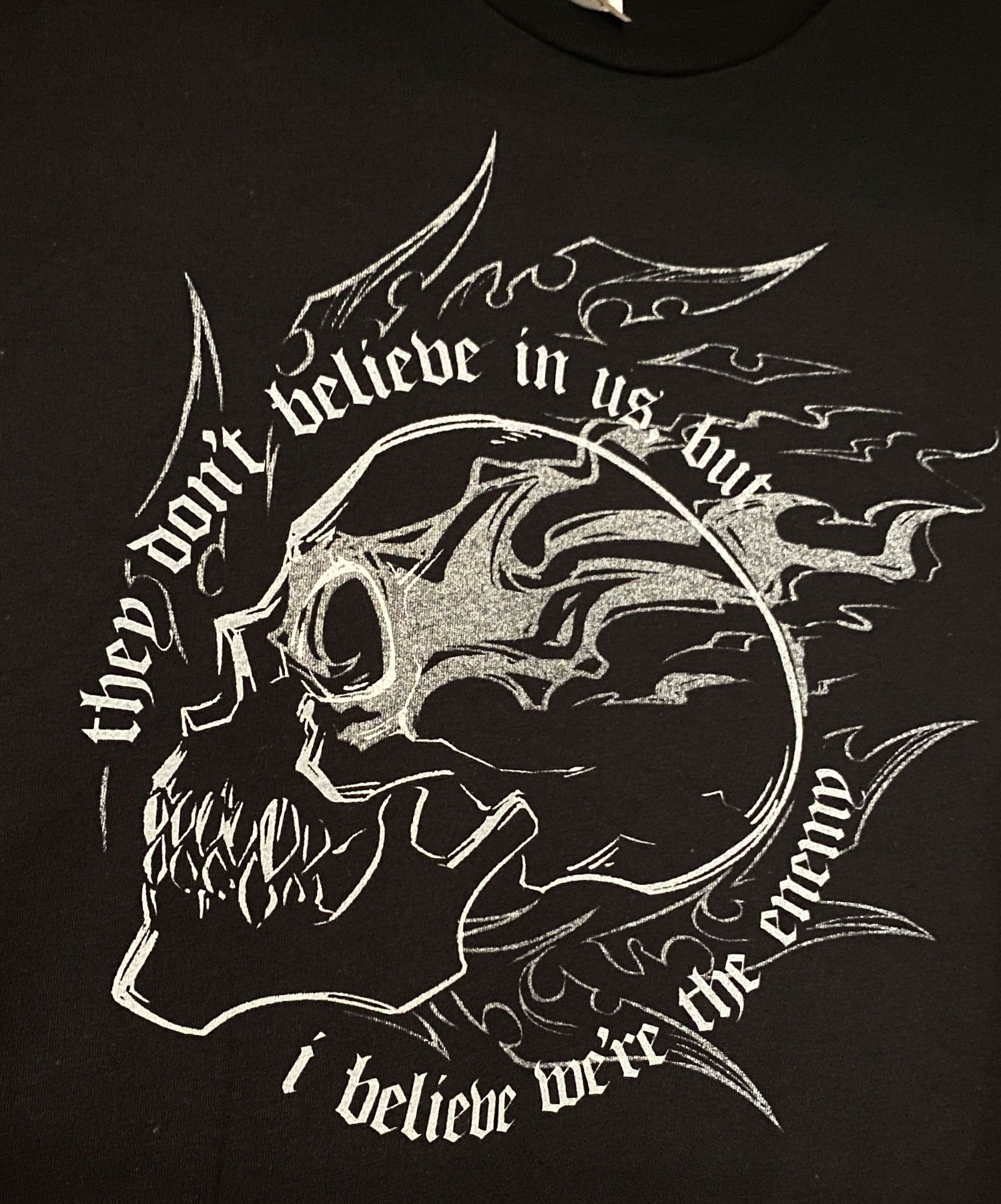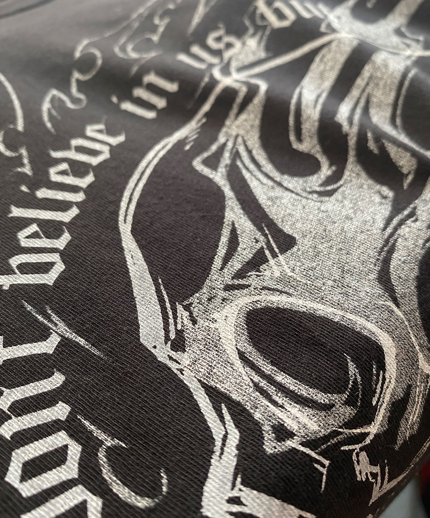 White and silver water based ink printed on a black Bella Canvas 100% cotton tee. Sizes XS-4XL available. Model in photos shown wearing a medium.